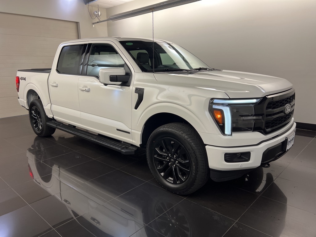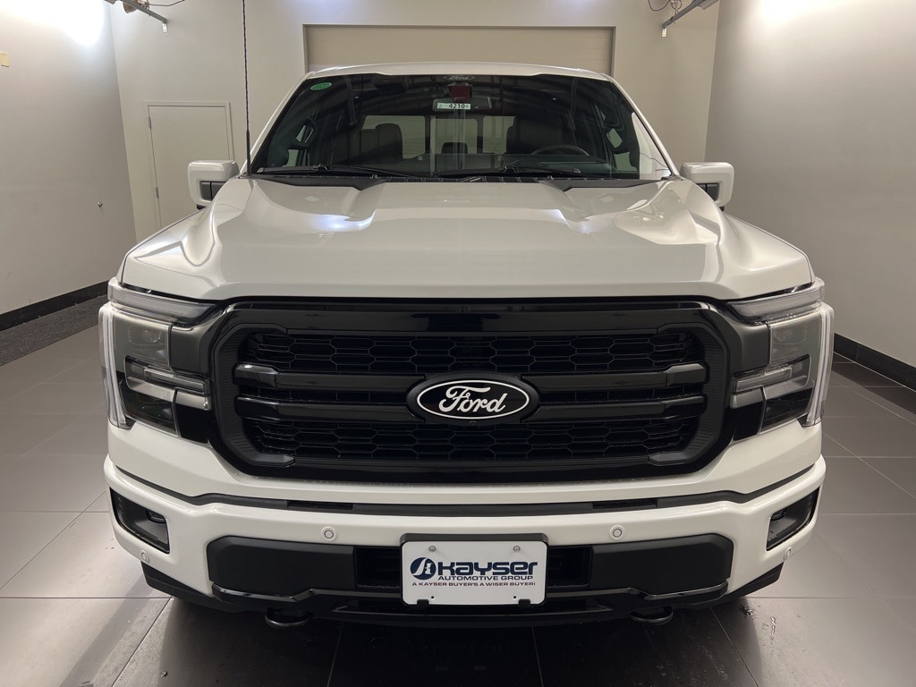 2025 Ford F-150 Lariat 2nd Row Heated Seats, ActiveX Trimmed Bucket Seats (B), Ambient Lighting - Ice Blue Color Only, Auto High-beam Headlights, Black Exterior Badging, Black Grille, Black Taillamp Bezels, Body-Color Front & Rear Bumpers, Body-Color Skull Caps & Door Handles, Brake assist, Console Worksurface, Dark Interior Appliques, Electronic Locking w/3.73 Axle Ratio, Equipment Group 502A High, Garage door transmitter, Gray Box Side Decal, GVWR: 7,400 lbs Payload Package, Heads-Up Display, Heated Front Seats, Heated steering wheel, Illuminated Driver & Passenger Visors, Illuminated entry, Lariat Black Appearance Package, Matte Black Tailgate F-150 Decal, Memory seat, Mobile Office Package, Navigation system: Connected Navigation, Partitioned Lockable Rear Storage, Pedal memory, Power-Sliding Rear Window, Pro Power Onboard - 7.2KW, Radio: B&O Unleashed Sound System by Bang & Olufsen, Rain sensing wipers, Remote keyless entry, Wheels: 20" Gloss Black Painted Aluminum, Wireless Charging.